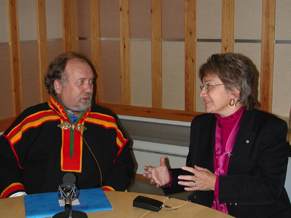 Finnish Saami parliament, Pekka Aikio and Mary May Simon, Canada’s first Arctic Ambassador, participate in an October 2003 round-table discussion for the Saami radio network in Inari, Finland. (PHOTO BY JANE GEORGE)