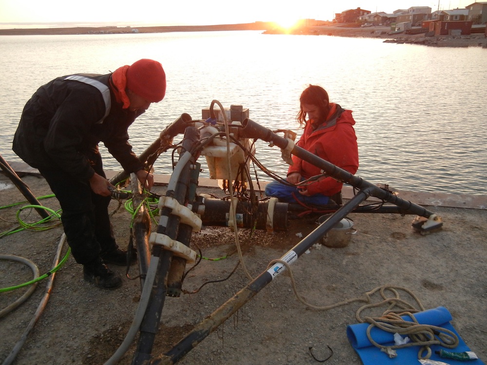 The waters near the Cambridge Bay dock stood at 1.9 C — and would, in fact, start freezing up the next day — but protected by drysuits, two divers managed to bring the marine observatory up to the surface and then hoist it on to the dock for its annual overhaul, a new platform and other new instruments.