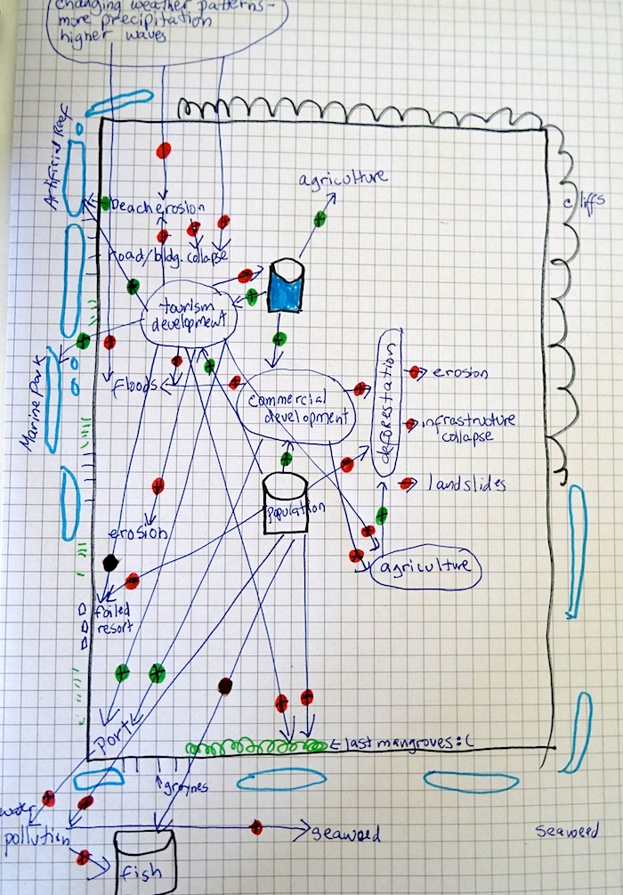 For the course, we are asked to draw a diagram showing all the interconnections between the ecosystem, threats and benefits on our island (my example — Barbados.) For that assignment, other students later evaluate my work, and they point out I have forgotten about ocean acidification, coral bleaching and not emphasized overfishing.