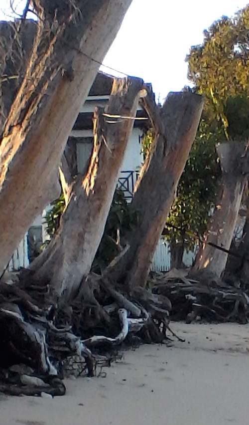After being having all the branches chopped off, the roots of these trees (seen above with their branches) then were cut off for a seawall. Now the trees are dead and the beach is eroding around what once was a natural wall against the sea. (PHOTO BY JANE GEORGE)